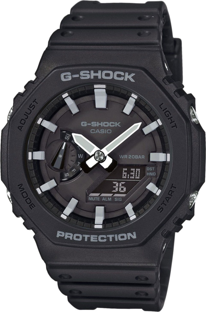 Усиленный углеродными волокнами резиновый корпус (Резина обладает высокой прочностью и является идеальным материалом для часов. В сочетании с высокой устойчивостью карбона мы имеем корпус, который по-прежнему способен выдержать высокую нагрузку и мало восприимчив к внешним воздействиям, и при этом предлагает дополнительную прочность);