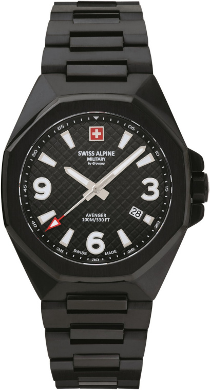 Маскулинные часы в винтажном милитари-стиле. Коллекция Avenger. Кварцевый калибр Ronda. Черный циферблат с геометрическим гильоше, крупными накладными индексами и арабскими цифрами, апертурой даты на «4 часах». Элементы индикации покрыты люминесцентным составом. Наконечник секундной стрелки, лого в виде флага Швейцарии красно-белого цвета. 42-мм корпус с восьмигранным сатинированным безелем, интегрированный браслет из нержавеющей стали. Черное PVD-покрытие. Маркировка «Swiss Made».