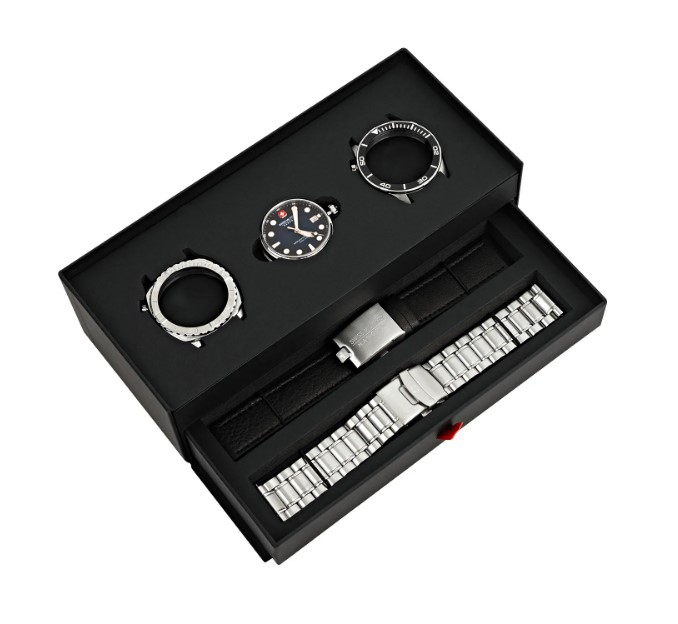 Этот набор «4 в 1» позволяет персонализировать внешний вид с помощью 2 безелей, 2 ремешков (из кожи премиум-класса и нержавеющей стали) и завораживающего синего циферблата. Инновационная система позволяет без труда менять ремешки, а водонепроницаемость до 10 АТМ гарантирует, что часы выдержат любые условия.